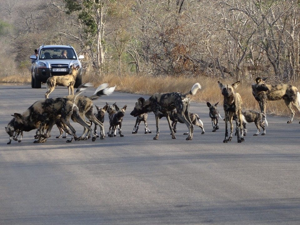There about 350 wild dogs in Kruger National Park and are endangered, so it is a rare occasion when you experience a siting of wild dog. Wild dogs are the size of a large domestic dog and its unusual coloration makes them quite easy