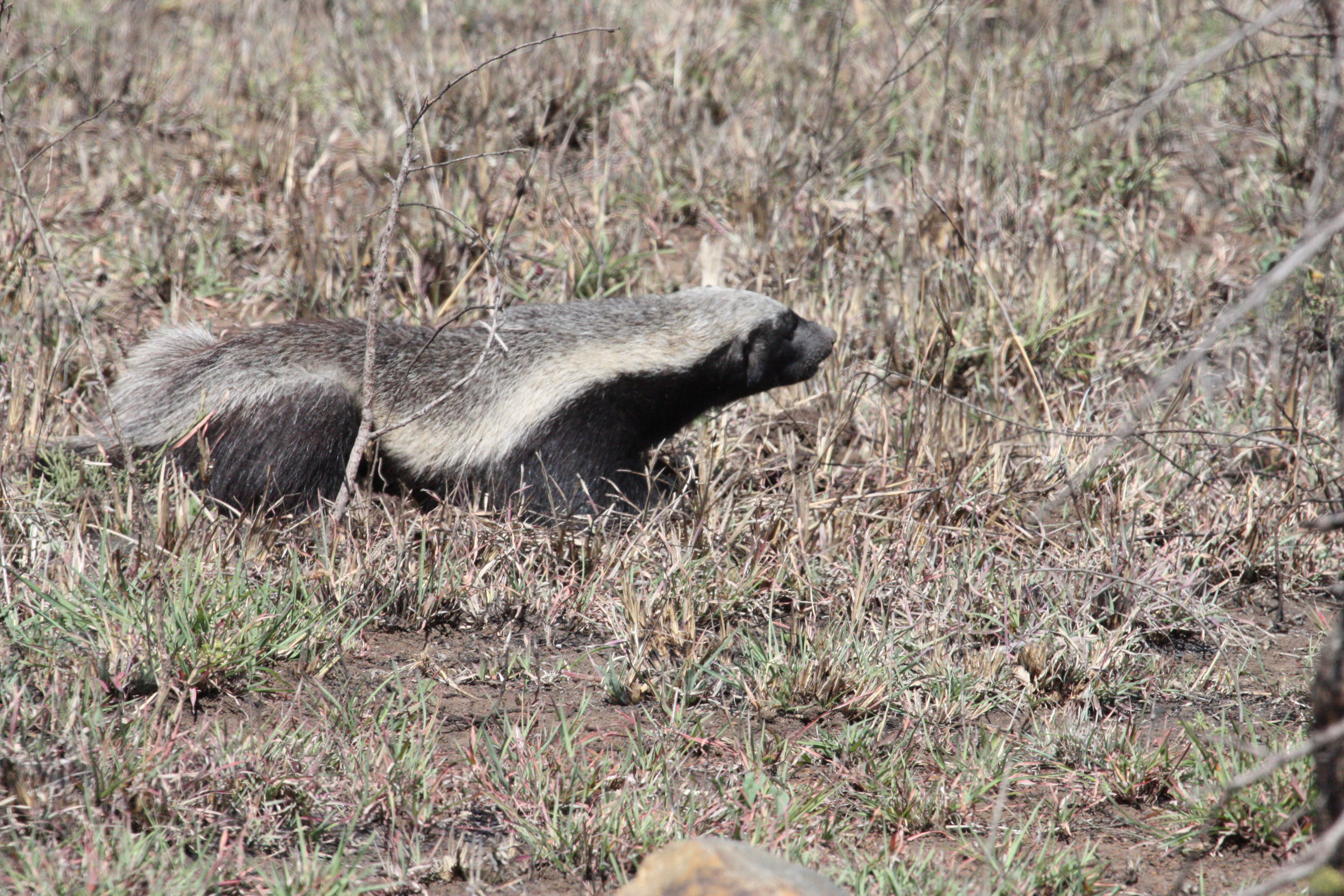 We were able to watch him for quite a while as he was near the edge of the road and very intent on his hunting. The second one I saw was further off and was more or less just traveling through the territory.(the photo of the Honey Badger with the garbage bin is not mine but from another lover of KNP)